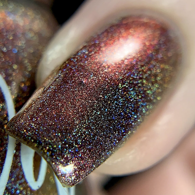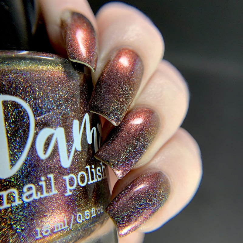 Change of Heart (Holo) is a black holochrome polish from the Valentine's Day Trio by Dam Nail Polish. This polish shifts from dark red to orange and has a holographic finish.